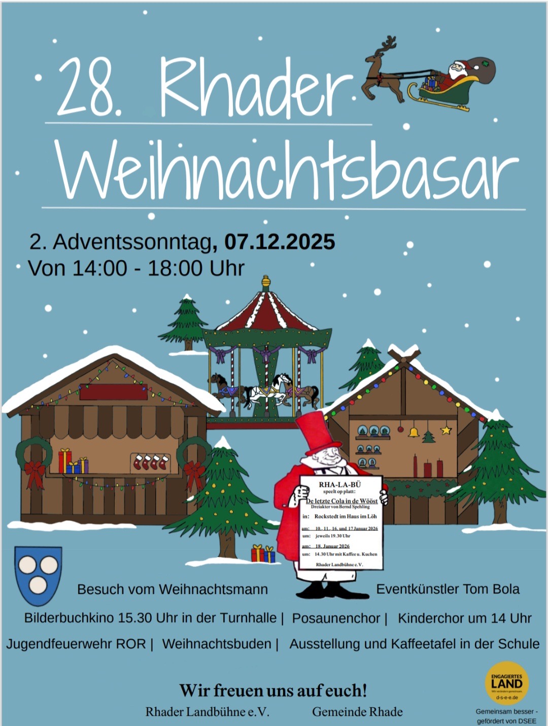 Besuch vom Weihnachtsmann Eventkünstler Tom Bola Bilderbuchkino 15.30 Uhr in der Turnhalle Posaunenchor Kinderchor um 14 Uhr Jugendfeuerwehr ROR Weihnachtsbuden Ausstellung und Kaffeetafel in der Schule Wir freuen uns auf…