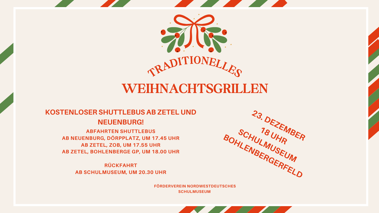 Stockbrot und Weihnachtsmann, kostenloser Shuttlebus und Grillen im Innenhof des Schulmuseums. Wir freuen uns auf ein gemütliches Beisammensein in besonderer Atmosphäre. 23.12.2025 ab 18 Uhr Veranstaltungsort Schulmuseum Bohlenbergerfeld Wehdestr. 97…