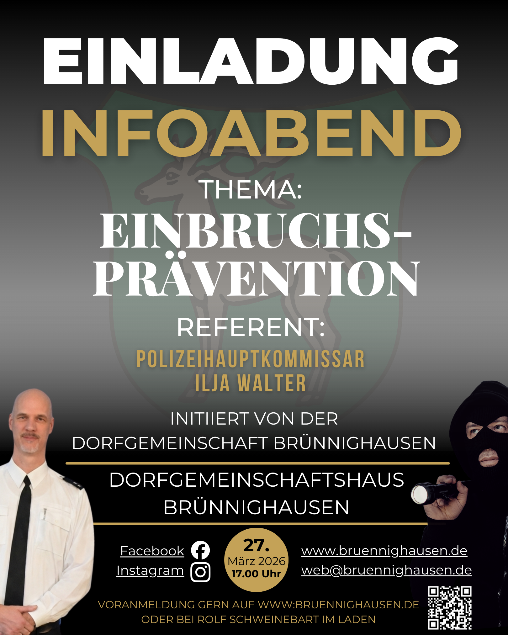Achtung ! Nicht vergessen! Infoveranstaltung zum Thema "Einbruchsprävention" ! Am Freitag, den 27.03. um 17.00 Uhr im Dorfgemeinschaftshaus Brünnighausen. Alle Gäste sind herzlich willkommen! Gerne auch vorher anmelden auf www.bruennighausen.de.… |