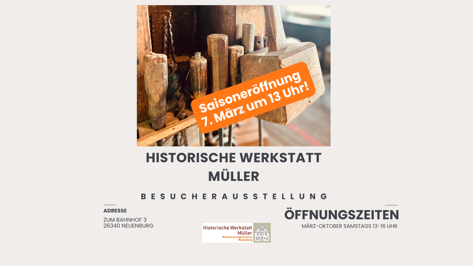 Die Historische Werkstatt Müller startet am 7. März in die Saison! Ab dem 7. März ist die Historische Werkstatt Müller im Ortskern Neuenburgs wieder regelmäßig Samstags geöffnet! Historische Werkstatt Müller…