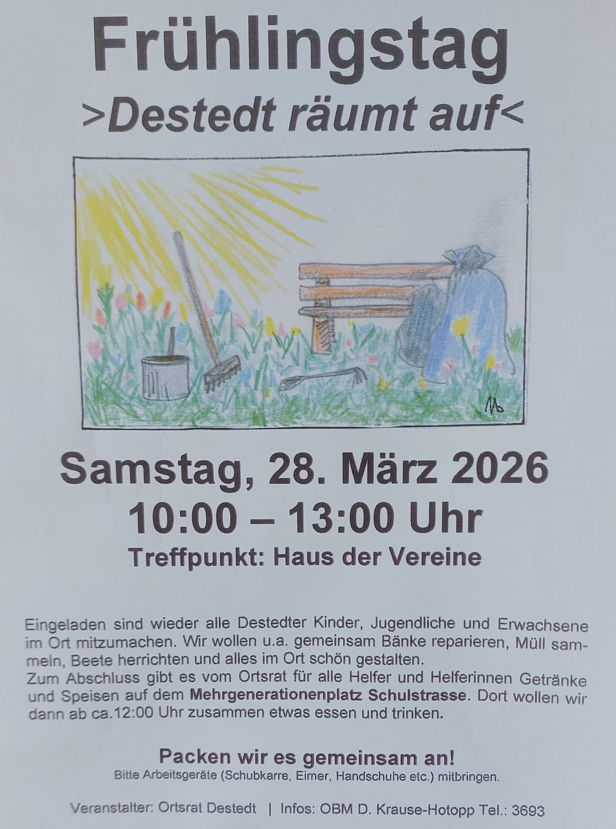 Am Samstag, den 28. März 2026, 10.00 bis 12.30 Uhr, findet auf Einladung des Ortsrates wieder der TAG FÜR DESTEDT statt. Eingeladen sind alle, die etwas für IHR Dorf tun…