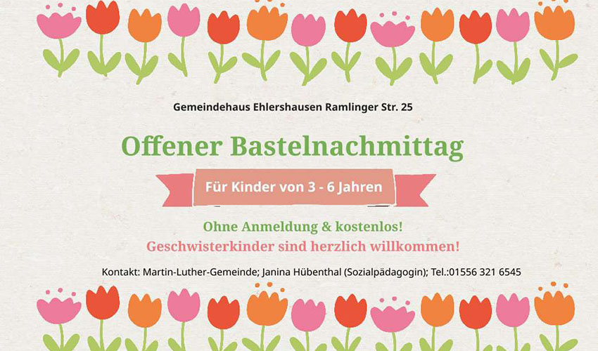 Am 25. Februar erwarten Euch im Gemeindehaus viele tolle winterliche Bastelaktionen - diesmal für alle Kinder von 6-10. Ihr könnt Euch aber auch an unserer freien Bastelstation austoben und Eurer…