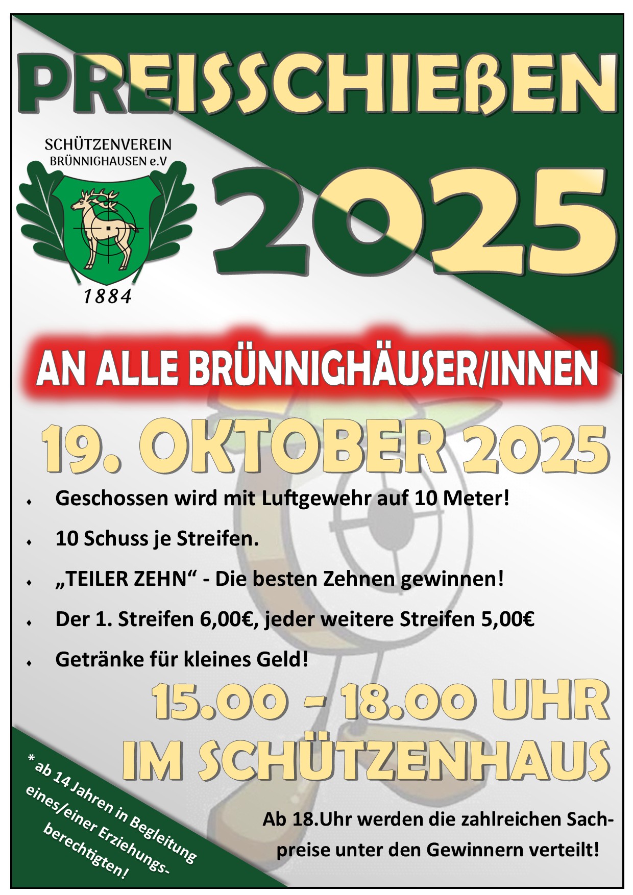 Am 19. Oktober von 15.00 -18.00 Uhr Preisschießen im Schützenhaus Brünnighausen für alle Brünnighäuser! Details siehe Flyer! |