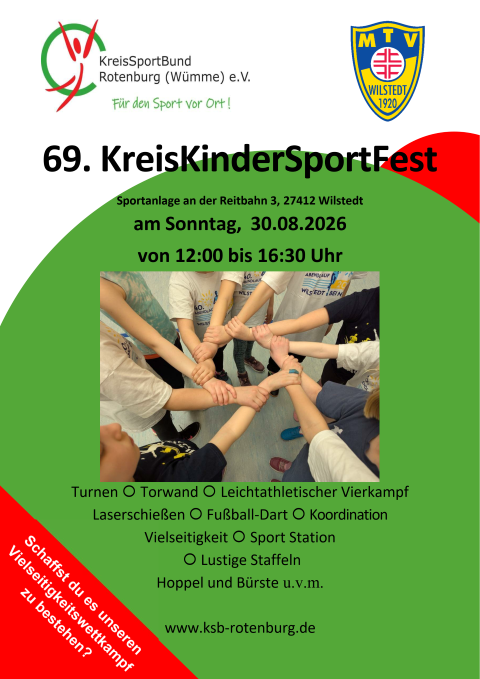 12:00 - 16:30 69. KreisKinderSportFest 30. August / 12:00 - 16:30 69. KreisKinderSportFest des KSB Rotenburg auf dem Sportgelände des MTV Wilstedt am 30.08.2026: Turnen, Torwand, Vierkampf, Laserschießen, Fußball‑Dart, Koordination, lustige Staffeln, HoppelBürste u.v.m. Anmeldung für Rhader Kinder z.B. über den TSV Rhade.…