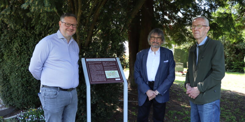 Foto (privat): v.l.: Sascha Flyholm (Braunschweigische Sparkassenstiftung), Ortsbürgermeister Dr. Diethelm Krause-Hotopp und Bernhard Brückner enthüllten die Tafel für Leutnant Rudolf Schimmelpfennig auf dem Destedter Friedhof.