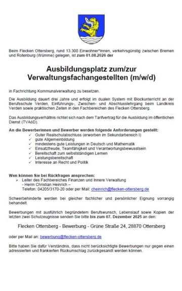 [Amtlicher Beitrag] Im Flecken Ottersberg hat einen Ausbildungsplatz zum/zur Verwaltungsangestellten (m/w/d) zu besetzten