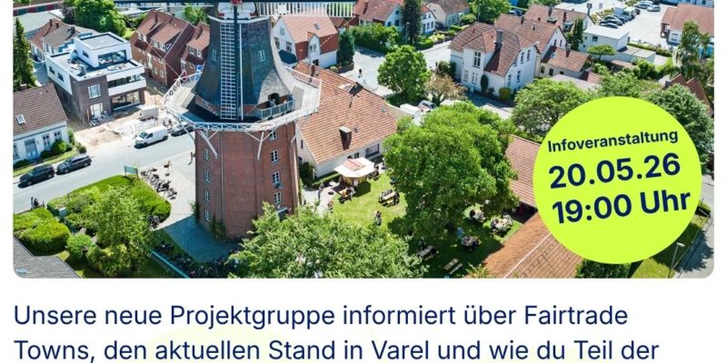 Die Stadt Varel ist auf einem guten Weg, Fairtrade-Town zu werden. Um über den aktuellen Stand, die nächsten Schritte und Beteiligungsmöglichkeiten zu informieren, lädt die Agenda Varel mit der Projektgruppe herzlich zu einer öffentlichen Informationsveranstaltung ein.