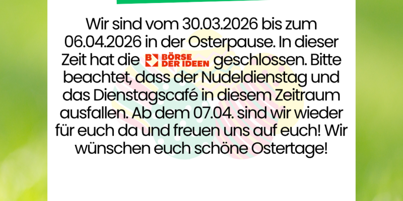 Wir sind vom 30.03.2026 bis zum 06.04.2026 in der Osterpause. In dieser Zeit hat die Börse geschlossen. Bitte beachtet, dass der Nudeldienstag und das Dienstagscafé in diesem Zeitraum ausfallen. Ab…