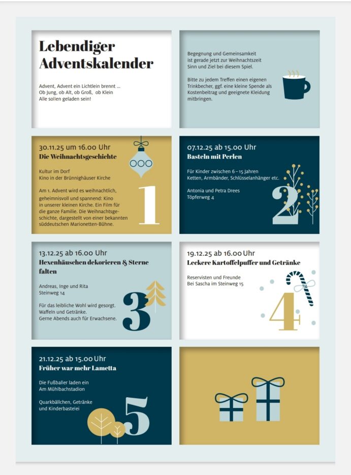 Fünf vorweihnachtliche Events sind dieses Jahr beim lebendigen Adventskalender in Brünnighausen zusammen gekommen.