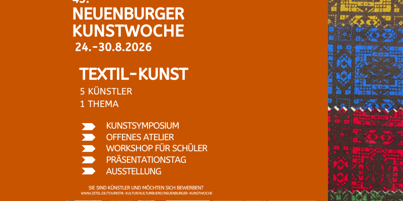 Thema “Textil-Kunst“ vom 24.08. – 30.8.2026 Unter dem Motto „Wir bringen die Kunst auf das Land“ lädt der Kunstverein „Bahner e. V.“ jährlich zur Neuenburger Kunstwoche ein, die ganz im Zeichen…