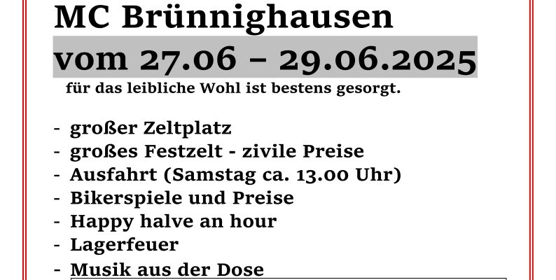 Liebe Brünnighäuser, liebe Brünnighäuser Neubürger Wie ihr durch den Aushang vielleicht schon mitbekommen habt, findet am 27.06. und 28.06.2025 unser alljährliches Motorradtreffen statt. Wir der Motorradclub Brünnighausen veranstalten das Motorradtreffen…