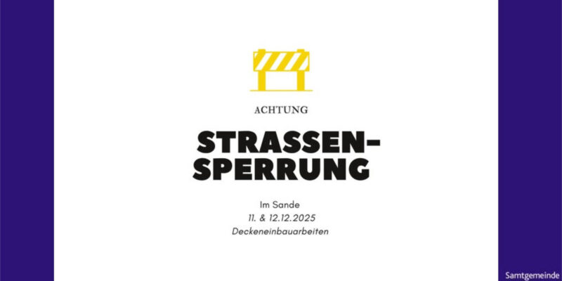 Vom 11. Dezember bis zum 12. Dezember 2025 ist eine kurzfristige Sperrung der Straße „Im Sande“ erforderlich, damit die Deckeneinbauarbeiten erfolgen können.