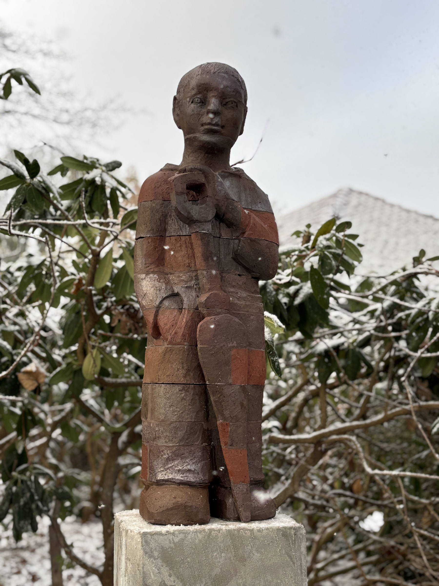 Die meisterlich ausgebildete Künstlerin hat die Figur mit frisch gepressten Steinen, die von der Klinkerziegelei Uhlhorn in Grabstede zur Verfügung gestellt wurden, aufgebaut – die verwendete Tonerde stammt überwiegend aus dem Abbau in Driefel. Während der Neuenburger Kunstwoche formte die Bildhauerin dann in einer komplexen Herangehensweise dieses Sinnbild für den in unseren Moorgebieten bekannten Torfstich. Von Neuenburg gingen die einzelnen Elemente zur Trocknung und zum Brand zurück zum Alten Klinkerzentrum in Grabstede, wo Töpfermeister Acki Jürgens den Brennvorgang sorgsam steuerte.
