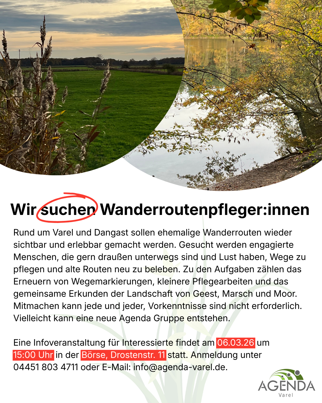 🥾 Varel belebt seine Wanderwege neu – mach mit!Rund um Varel und Dangast gab es früher eine aktive Wandertradition. Daran möchte die Agenda Varel jetzt anknüpfen und eine neue Ehrenamtsgruppe zur Wanderroutenpflege aufbauen. Gesucht werden wanderbegeisterte Menschen, die Lust haben, historische Wege wieder sichtbar zu machen und dauerhaft zu betreuen.