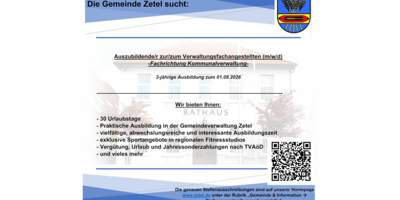 Die Gemeinde Zetel beabsichtigt zum 01.08.2026 eine/n Auszubildende/n zur/zum