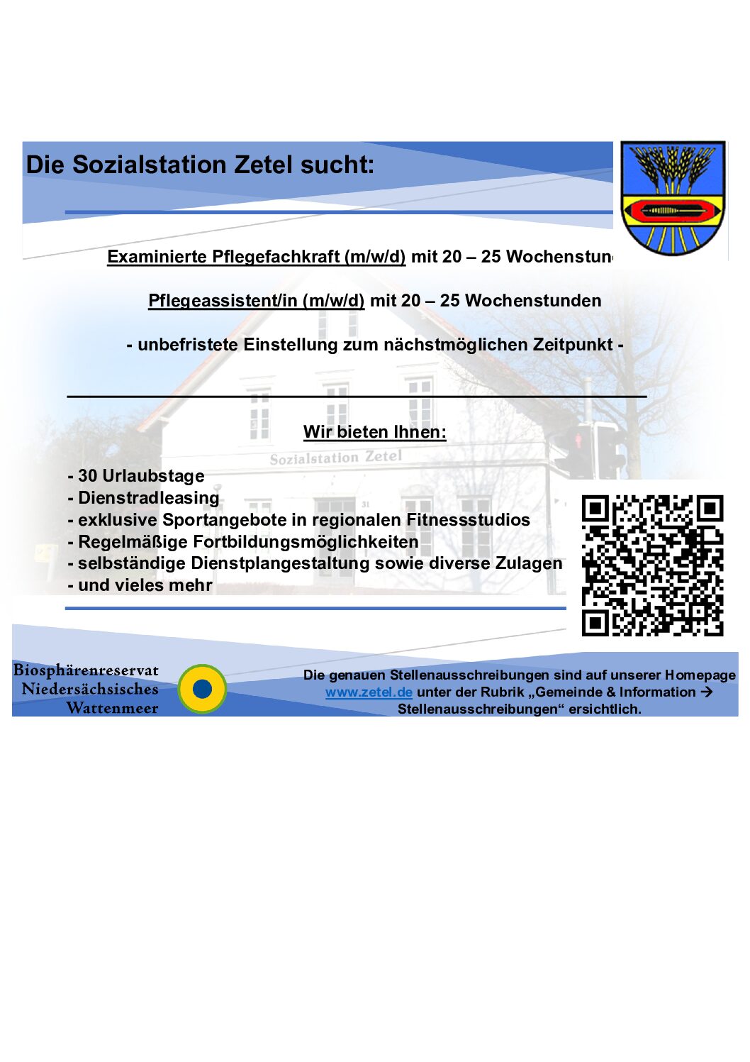 [Amtlicher Beitrag] Wir suchen: Pflegeassistent/in (m/w/d) für die Sozialstation der Gemeinde Zetel