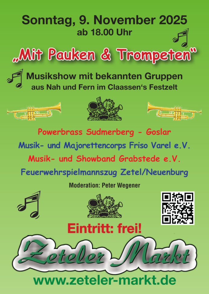 Zum 16. Mal heißt es dann am kommenden Sonntag, 9. November auf dem Zeteler Markt: mit Pauken und Trompeten! Die finale Abstimmung erfolgte am Donnerstag in Claassen´s Festzelt, denn hier findet die beliebte Musikshow mit Gruppen aus Nah und Fern statt. Der Eintritt, zu der von Peter Wegener moderierten Show, ist frei. Zu Gast sind die Gruppen Powerbrass Sudmerberg-Goslar, das Musik- und Majorettencorps Friso, die Musik- und Showband Grabstede und der Feuerwehrspielmannszug Zetel/Neuenburg.